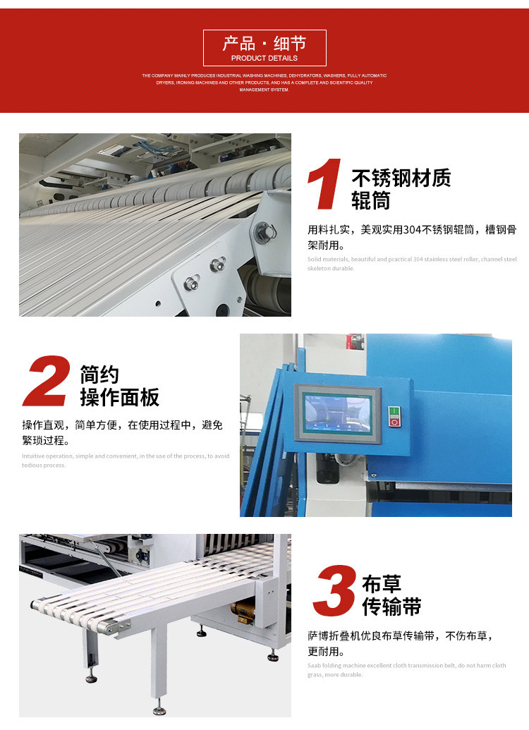 工業(yè)折疊機(jī)采用大屏點(diǎn)陣液晶顯示及智能化控制系統(tǒng)。并且有良好的中英文人機(jī)對話界面;在電腦控制下完成五次折疊?v折和橫折次數(shù)可按織物幅度、厚度自由編程;采用高智能化的紅外線檢測系統(tǒng),取消了傳統(tǒng)的機(jī)械脈沖技術(shù)裝置;具有雙通道折疊功能,可雙倍提高小型布草的熨平折疊能力,降低耗能;運(yùn)轉(zhuǎn)速度調(diào)節(jié)范圍大,能與各種相應(yīng)的熨平機(jī)匹配;具有自診斷功能,完善的安全保護(hù)系統(tǒng),監(jiān)測點(diǎn)自保養(yǎng)功能;電腦板采用繼電器輸出,無需中間繼斷器減少了故障點(diǎn),維修檢測方便;各控制組件均采用直流24v低壓組件,安全可靠,便于直接維修;各控制閥均采用氣動控制,動作迅速可靠,對周圍環(huán)境無污染;本設(shè)備多處裝有安全開關(guān),使用安全可靠。